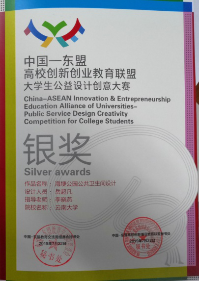 东盟高校创新创业教育联盟“大学生公益设计创意大赛”银奖。同时,李晓燕老师荣获优秀指导教师奖。