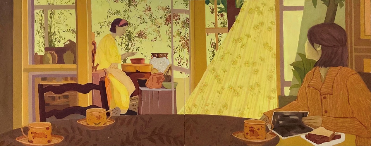 李青《窗畔的慢调》布面油画 80×200cm 2025年